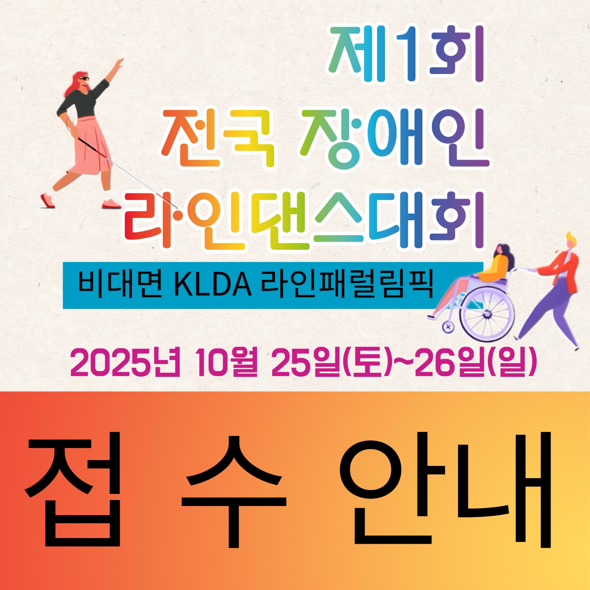 라인댄스를 즐기는 데, 그 어떤 불편함도 장애물이 될 수 없습니다. 라인댄스로 하나가 되는 세상을 함께 만들기 위해 대한라인댄스 협회는 노력하고 있습니다. 그 일환으로 제 1회 전국 장애인 라인댄스 대회(비대면)을 개최합니다. 많은 응원과 격려를 부탁드리겠습니다. *일시 : 2025년 10월 25일(토) ~ 26일(일) *참가대상 : 시각, 청각, 지적, 휠체어 - 단체전 *접수기간 : 2025.10.1(수) ~ 10.22(수) 15:00마감 *접수방법 : 이메일-klda3191@naver.com 제출서류-참가신청서 : https://naver.me/5qcCf3rE 댄스동영상(3분30초) *접수비 및 입금계좌 선수 1인당 10,000원 우리은행 1005-902-694564 사)대한라인댄스협회 *상금 대상 : 300,000원 1등 : 100,000원 2등 : 50,000원 3등 : 상장 *문의 : 010 6682 3191 010 2168 7512 (장애인경기위원장) *모집요강 : 장애인라인댄스대회공문및참가요강.hwp