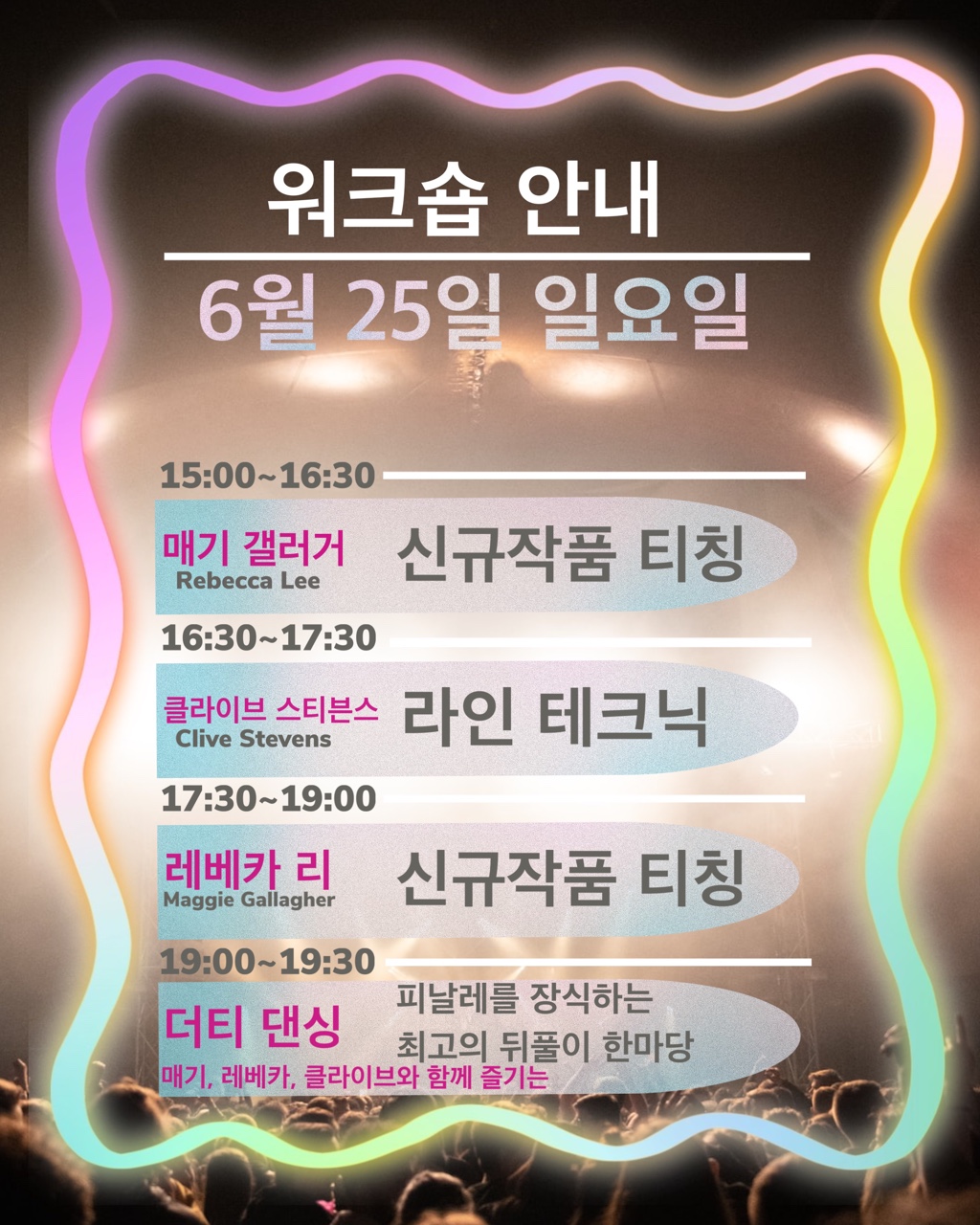 세계적인 안무가 매기 갤러거와 레베카 리의 미공개 신작을 처음 배울 수 있는 기회를 놓치지 마시기 바랍니다.
