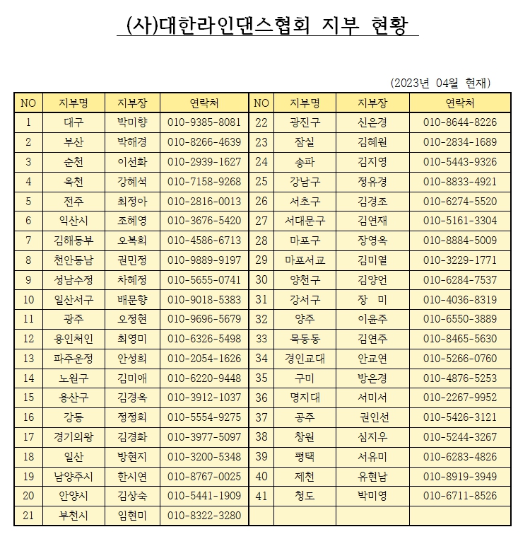 (사)대한라인댄스협회 지부현황 (2025년 3월)