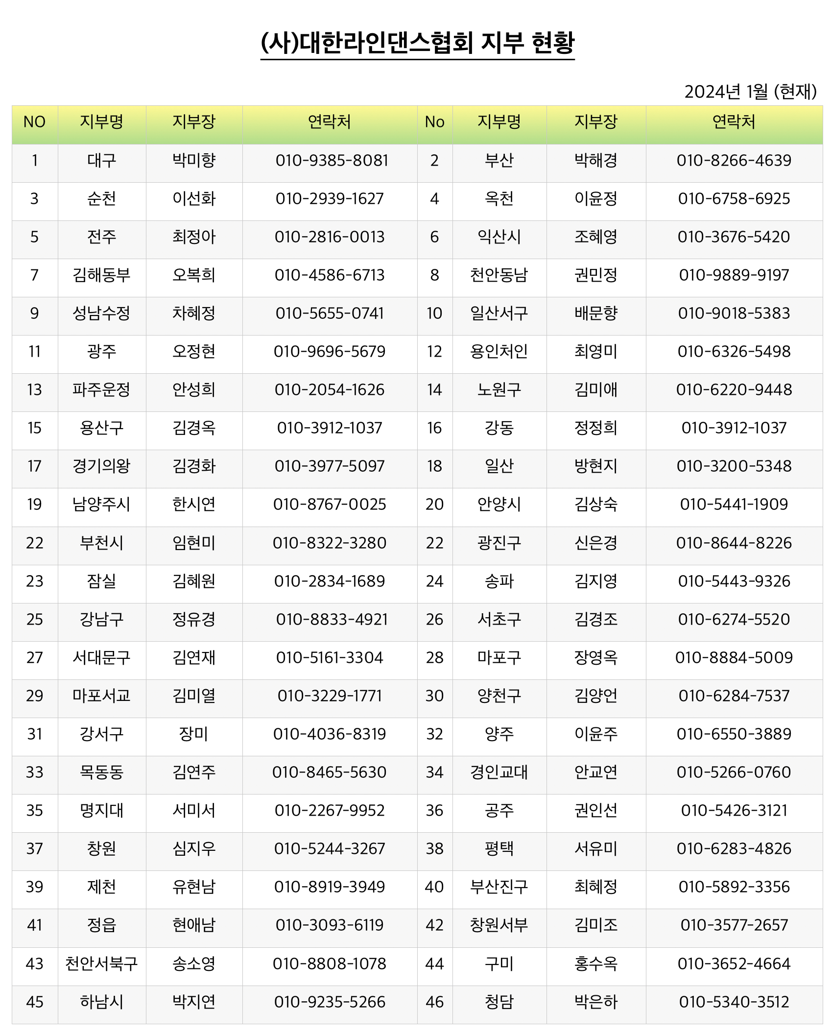 (사)대한라인댄스협회 지부 현황(2024년 1월)