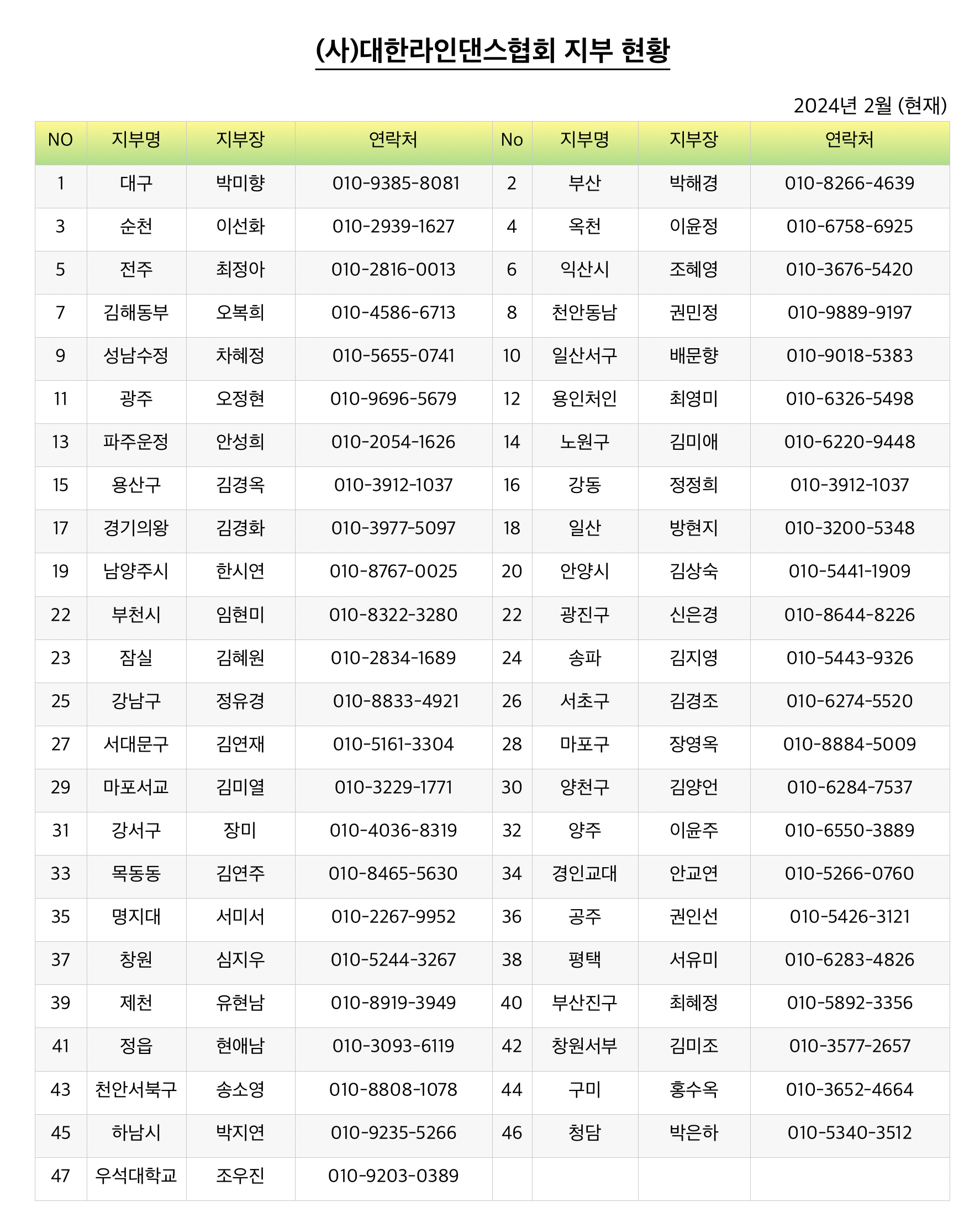 (사)대한라인댄스협회 지부 현황(2024년 2월)