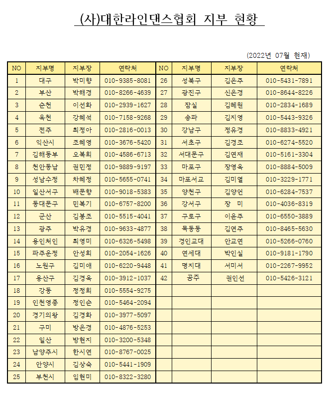 (사)대한라인댄스협회 지부현황 (2025년 7월)