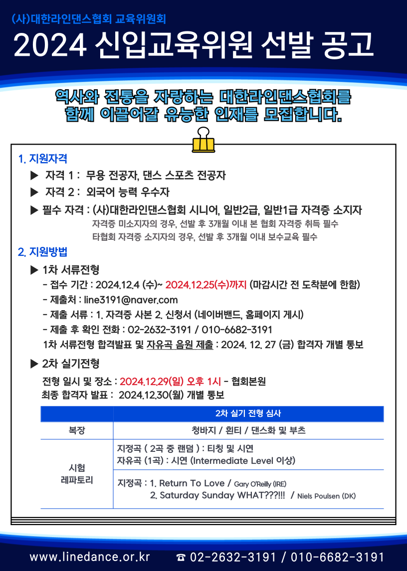 교육위원의 역활: 봉사와 책임의식을 바탕으로 라인댄스자격증교육,심판,경기에 관한 기량향상과 의사결정의 직무를 수행합니다.