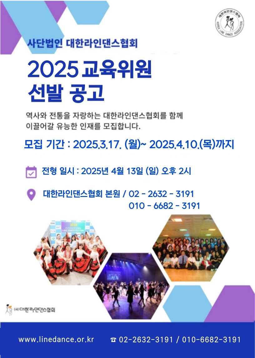 여러분의 도전을 응원하며 대한라인댄스협회를 함께 이끌어갈 2025년 신입교육위원을 모집합니다.