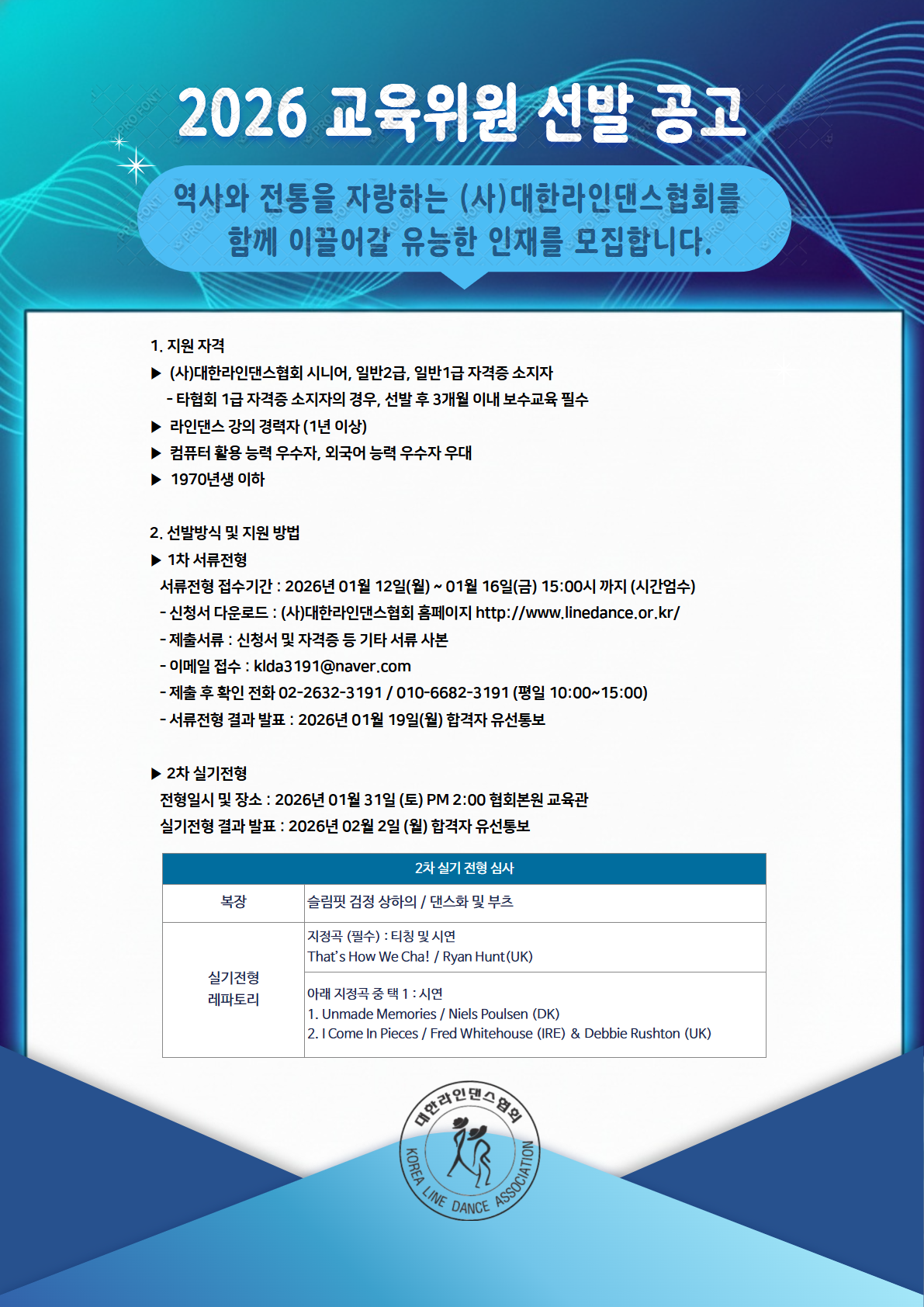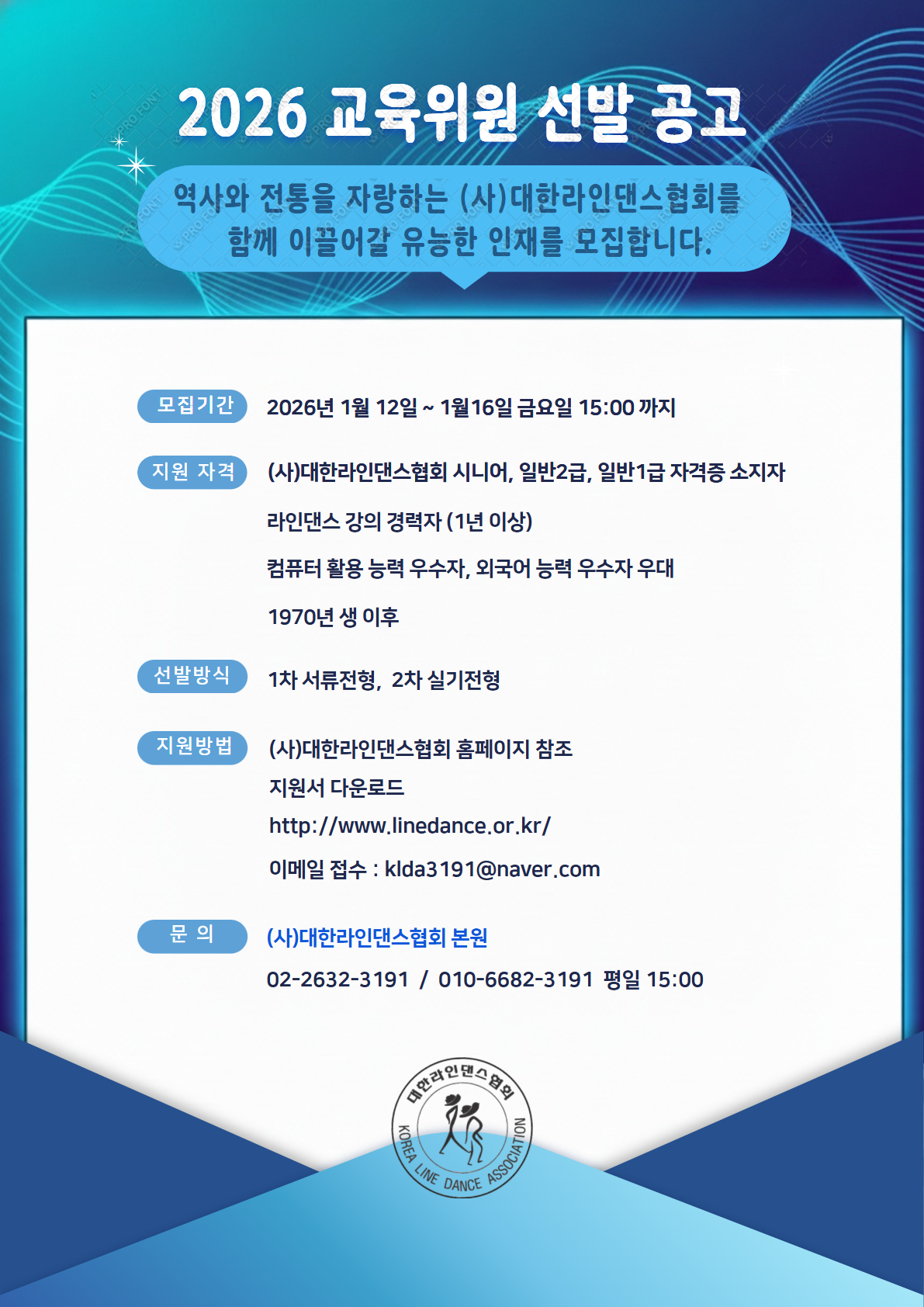 역사와 전통을 자랑하는 (사)대한라인댄스협회를 함께 이끌어갈 유능한 인재를 모집합니다.