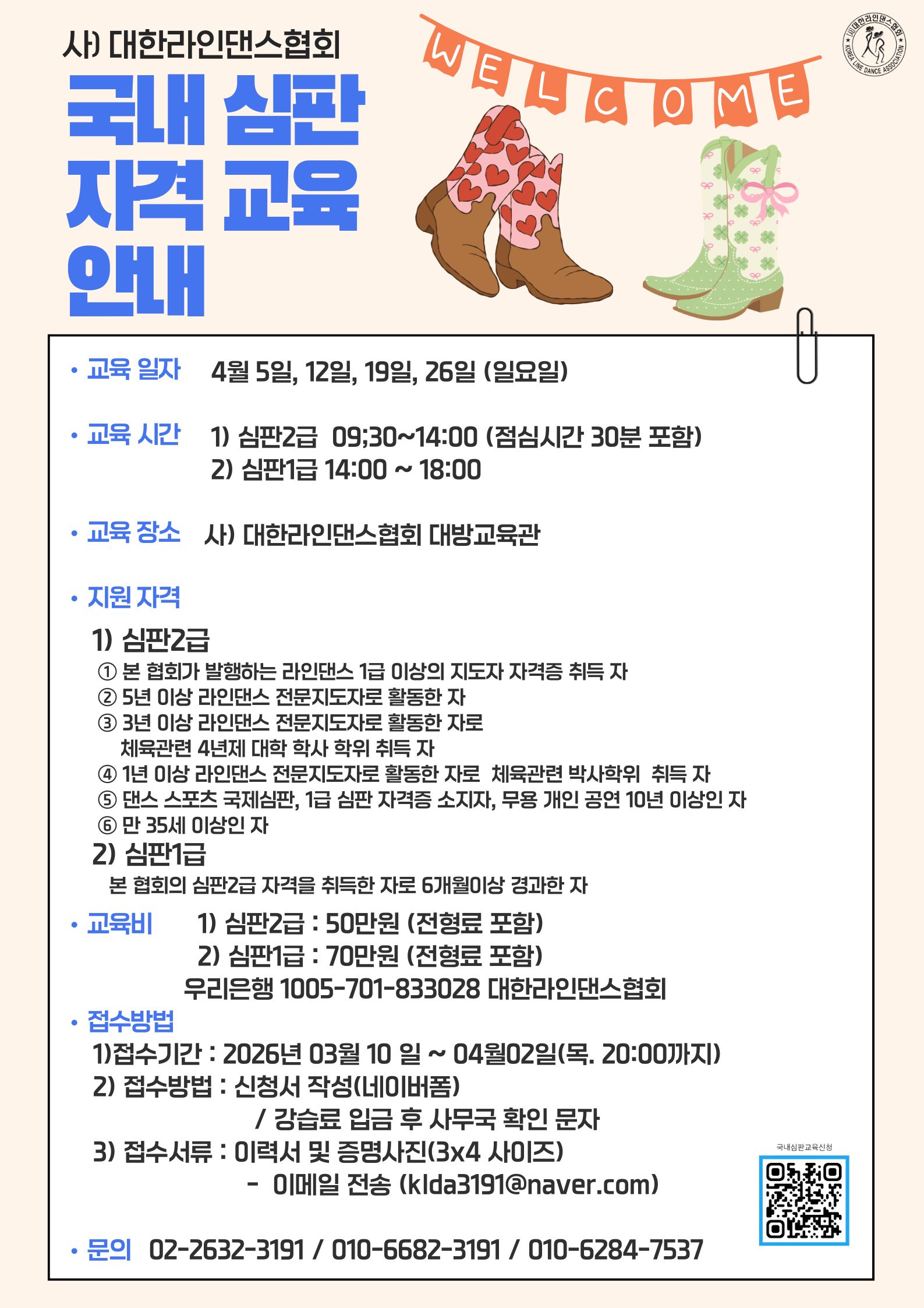 2026 제 12회 국제라인댄스페스티벌 아일랜드캐슬 호텔 앤 워터파크 2026 06.26~27(1박) 조식포함 패키지 더블룸 1) 1박. 1인 120,000원 2) 1박. 2인 160,000원 3) 1박. 1성인/1아동 153,000원 (아동 48개월~만 10세/48개월 이하 무료) 트윈룸 4) 1박. 3인 210,000원 5) 1박. 2성인/1아동 203,000원 6) 1박. 1성인/2아동 196,000원 (아동 48개월~만 10세/48개월 이하 무료) * 28일 연장투숙시에도 같은 금액 적용 ** 신청방법 :큐알코드 스캔 후 신청 폼작성 ***입금계좌 :우리은행 사단법인 대한라인댄스협회 ( 1005-902-694564 ) 신청폼 링크 : 호텔신청서(26국제대회 아이랜드캐슬) - 네이버 폼 문의 : 사) 대한라인댄스협회 02-2632-3191, 010-6682-3191